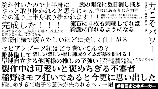 先日のイベントで『自分のぬいぐるみの技量が足りてないのでは』と不安になった稲野。他所様の子作りますと募集して、フォロワーさんから推しの子借りてアストルティアから現世に召喚した。