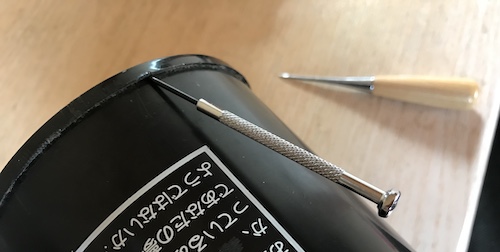 横にずらしながら千枚通し君を突くことで、ちょっと隙間らしい感じのができてきました。マイナスドライバー君が刺さります。