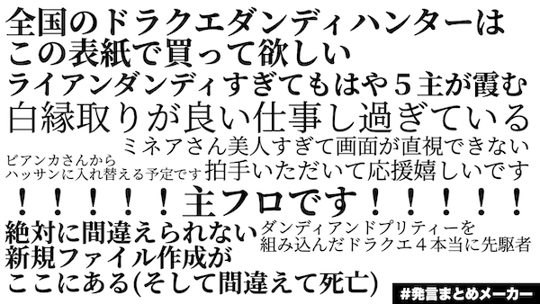 これも今までのアンソロジー参加者様のご縁が大部分ですが、本気絵での宣伝やら、やるだけやりきった結果だと思います。DQ小説界隈のお祭り的企画として、DQ小説を愛する方々にも楽しんでもらえるようなアンソロジーを頒布したいと思います!